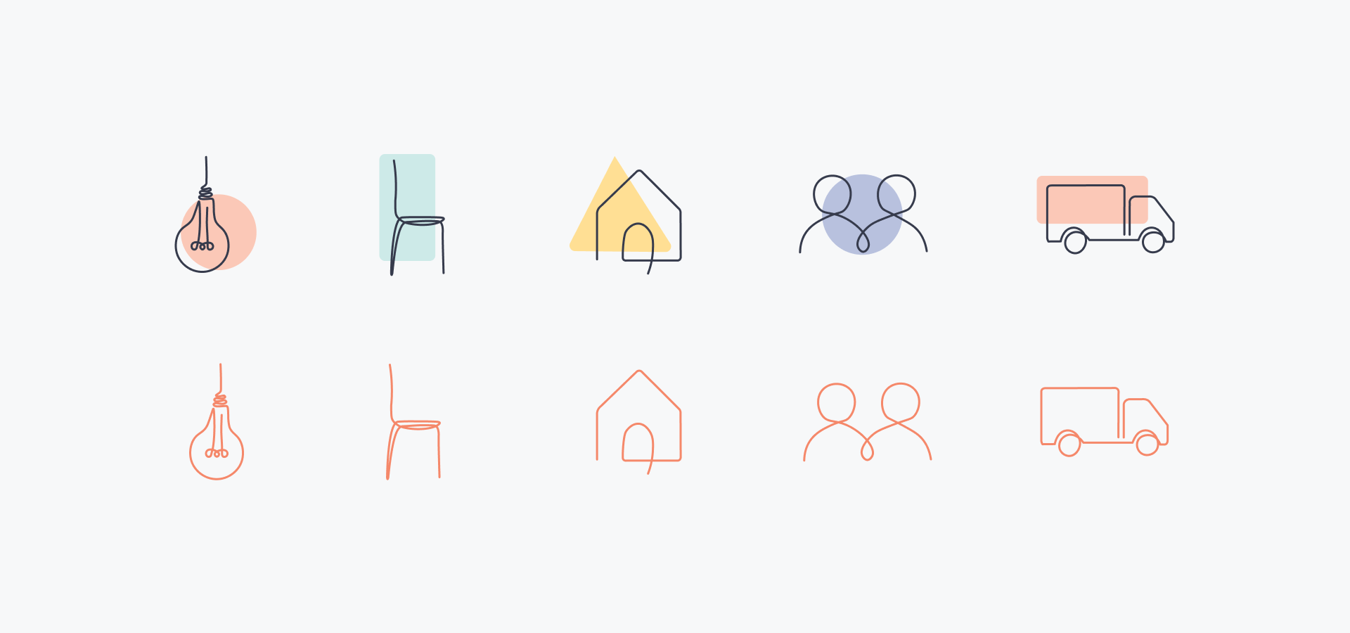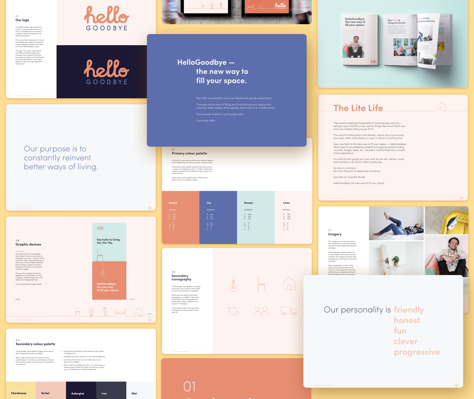 The branding for HelloGoodbye plays on the flow and continuity of life, where furnishing your home should be a transitory aspect and fuss-free as possible.